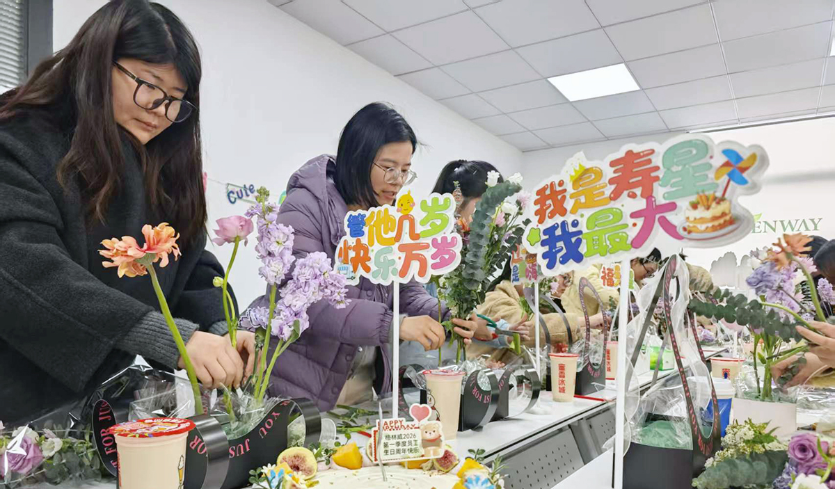 As spring arrives and flowers bloom, Suzhou Greenway Biotech held a Q1 employee birthday and work anniversary event themed “Blooms at Fingertips, Glow with Grace; March Together Toward the Future” on March 20, 2026. Company leaders and all staff gathered to celebrate growth and beauty in a spring atmosphere filled with fragrance and laughter.
