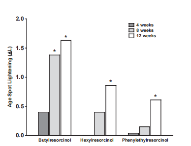 resorcinol (Fig. 3). Within 8 weeks, 4-butylresorcinol significantly reduced the appearance of age spots while 4-hexylresorcinol or 4-phenylethylresorcinol showed significant effects after 12 weeks (all in comparison to vehicle). Epi-Flash photographs revealed visible improvement in the appearance of age spots after 12 weeks of treatment with 4-butylresorcinol. Control age spots remained unchanged (not shown).