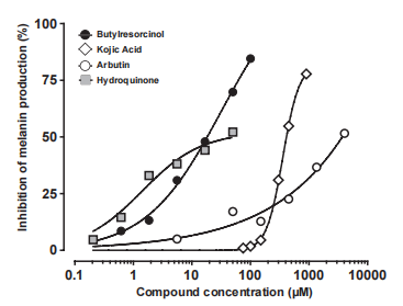 Figure 2. Inhibition of melanin production in MelanoDermskin models by 4-butylresorcinol, kojic acid, arbutin and hydroquinone. Melanin content of skin models was determined after 13 days of cultivation in the presence of various inhibitor concentrations. Data represent the mean of five independent experiments.