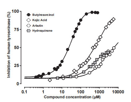 cule raised their concern, and consequently the SCCP regards the use of arbutin in cosmetic products as unsafe.18 The published tyrosinase IC50 values for kojic acid vary between less than 20 lmol ⁄ L19 up to more than 100 lmol ⁄ L.20 On human tyrosinase, kojic acid is less effective with an IC50 of about 500 lmol ⁄ L. On MelanoDerms, kojic acid shows a surprisingly steep dose–response curve, from more than 75% inhibition at 900 lmol ⁄ L down to 5% at 150 lmol ⁄ L. This might explain, in part, the very limited efficacy of kojic acid in vivo. Concerning the safety of kojic acid, the European Scientific Committee on Consumer Safety21 now considers kojic acid in concentrations up to 1.0% safe for cosmetic products when applied to healthy skin, this view is shared by the Cosmetic Ingredient Review Expert Panel. The 4-substituted resorcinol motif has been known for a long time as a very powerful chemical moiety for the inhibition of human tyrosinase. Many natural compounds, mainly flavonoids, known as whitening ingredient contain this resorcinol motif.19,24 Unfortunately, the bioavailability of flavonoids is generally very low, and we therefore searched for smaller resorcinols with high effectiveness and good bioavailability. Among these resorcinol derivatives, 4-butylresorcinol has been characterized as a strong tyrosinase25 and TRP-126 inhibitor. We measured an IC50 in the human tyrosinase assay of 21 lmol ⁄ L for 4-butylresorcinol compared with 94 and 131 lmol ⁄ L for 4-hexylresorcinol and 4-phenylethylresorcinol respectively. Also on skin models, 4-butylresorcinol was most effective of all tested substances with an IC50 of 13.5 lmol ⁄ L. Therefore, 4-butylresorcinol was for several clinical studies to prove in vivo efficacy. In comparison with 4- hexylresorcinol and 4-phenylethylresorcinol, 4-butylresorcinol treated age spots showed a faster onset of improvement and also a higher degree of lightening after 12 weeks of treatment. A study with a spot applicator showed continuous improvement over the entire treatment period and even after ceasing treatment, the age spots remained for 4 weeks significantly lighter than control spots. Even 13 weeks later, some of the spots still showed some improvement. Based on these results, a skin care line was developed and